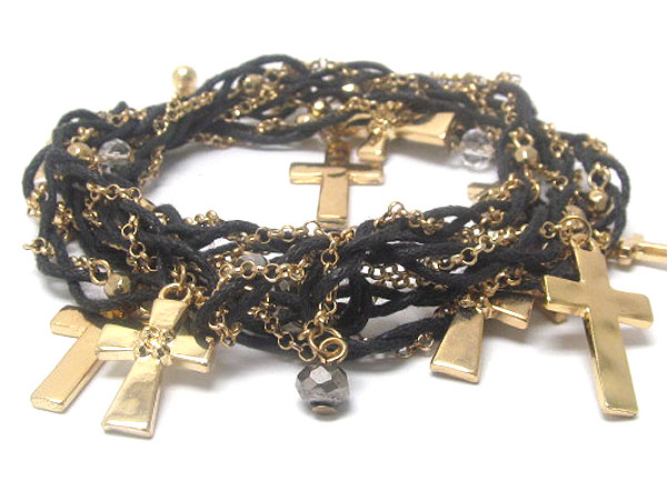 WHOLESALE METAL CROSS CHARM DANGLE WITH MULTI CRYSTAL GLASS AND METAL SMALL BALLS FASHION CORD WRAP BRACELET 381847