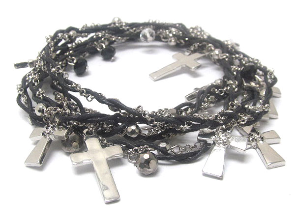 Metal cross charm dangle with multi crystal glass and metal small balls fashion cord wrap bracelet