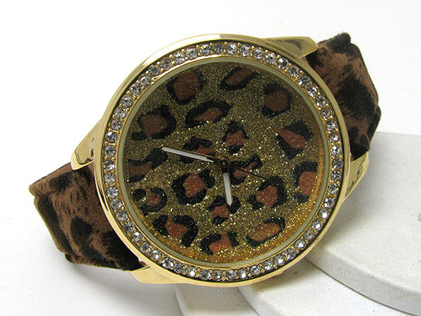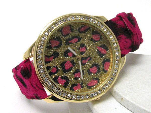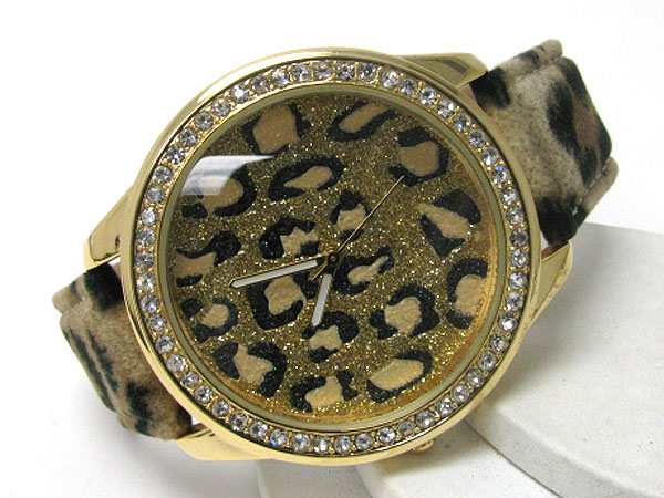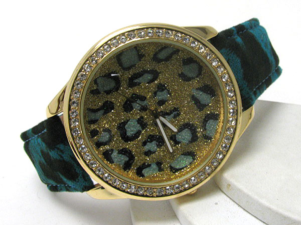 Crystal deco frame and glittering face with animal pattern band watch