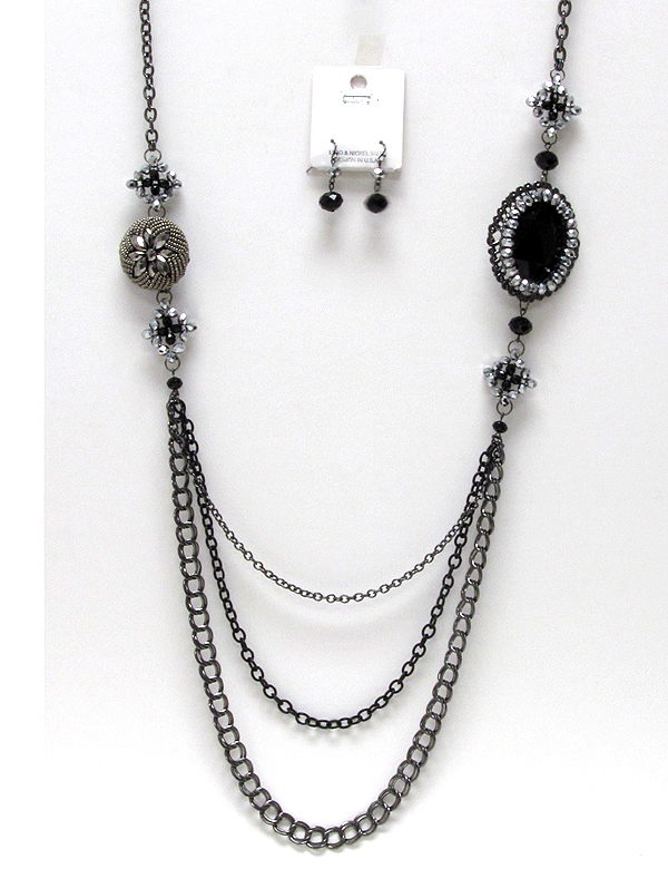 Metal oval shape filigree inside crystal stone with multi crystal glass and round multi seed beads drop with multi long chain necklace earring set