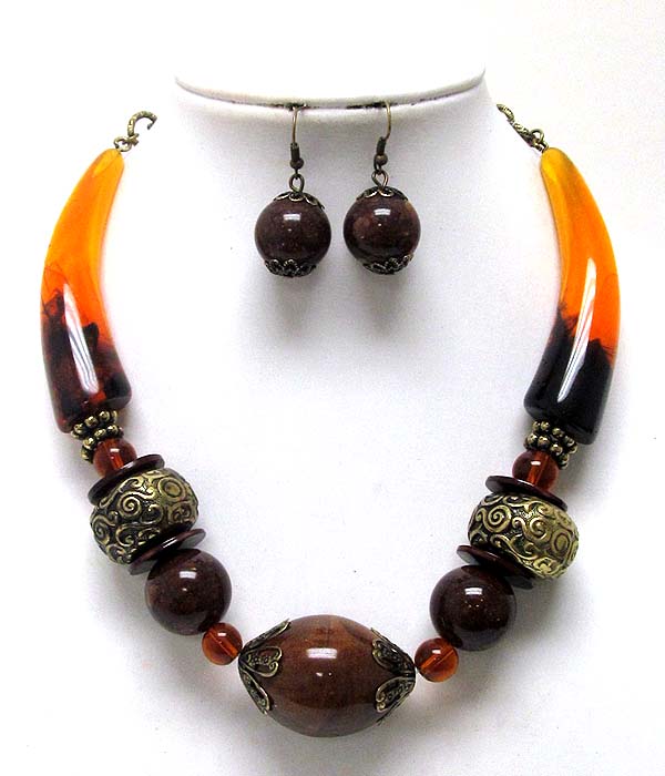 Natural stone ball mixed metal ball link horn backing necklace earring set