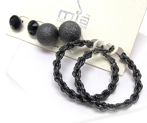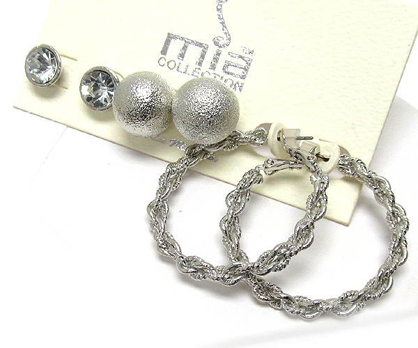 WHOLESALE SANDY BALL CRYSTAL AND TWIST METAL HOOP 3 PAIR EARRING SET - HOOPS 386144