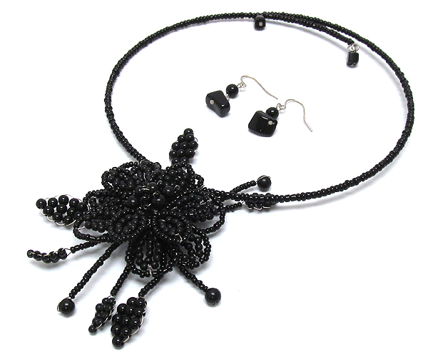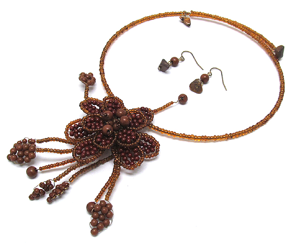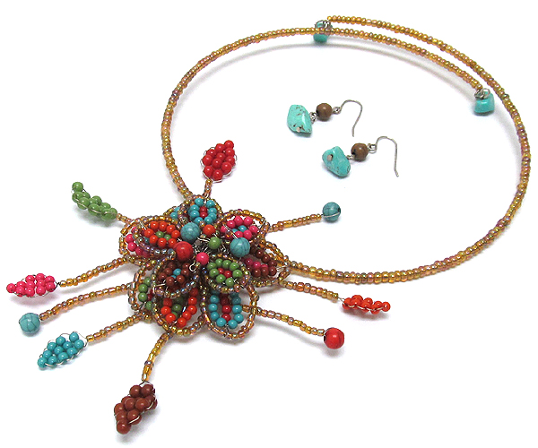 Large wierd flower mix seed beads and stone ball pendant seed beads wierd choker necklace earring set