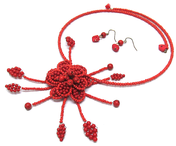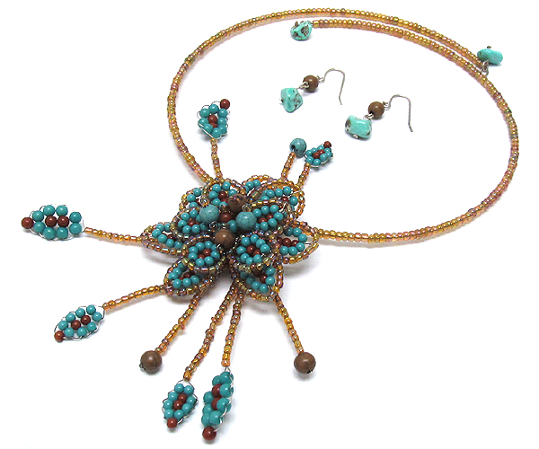 WHOLESALE LARGE WIERD FLOWER MIX SEED BEADS AND STONE BALL PENDANT SEED BEADS WIERD CHOKER NECKLACE EARRING SET 386427