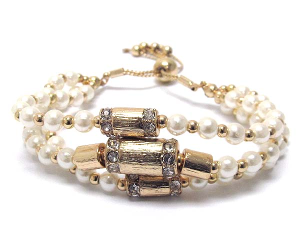 WHOLESALE THREE CRYSTAL DECO METAL TUBE AND MULTI PEARL BEADS BRADED CORD BRACELET 386508