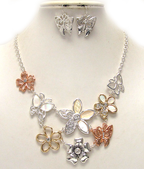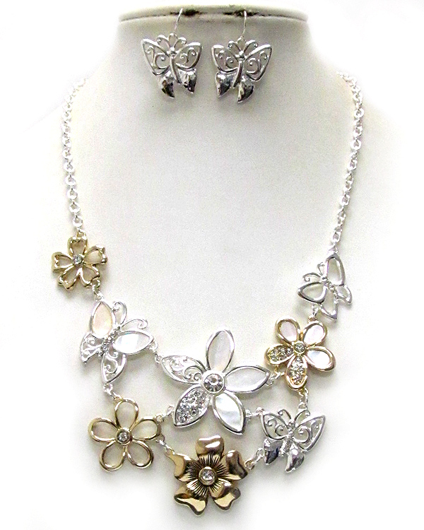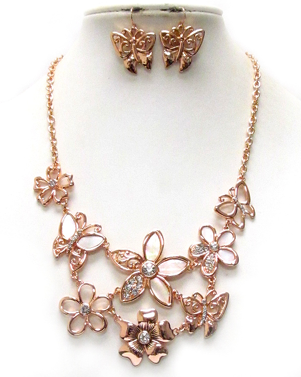 Multi crystal metal textered patern and cut out shell flower disk and butterfly chain necklace earring set