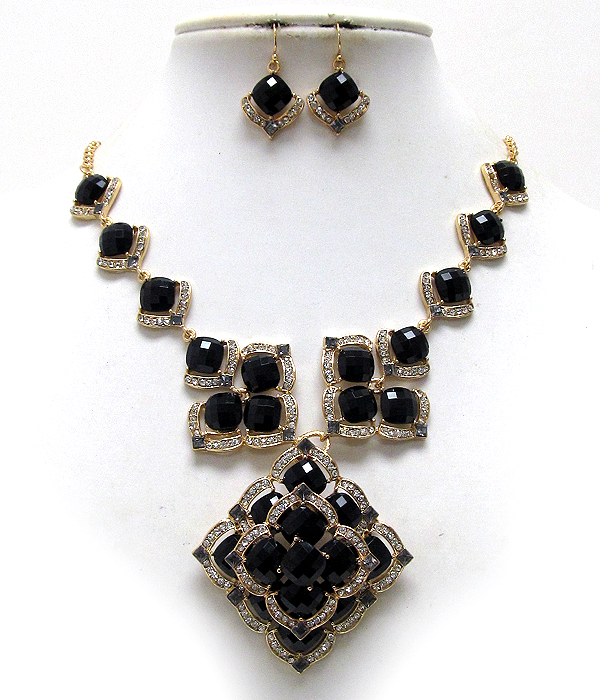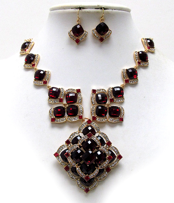 WHOLESALE CRYSTAL SQUARE GLASS WITH CRYSTAL ON FLOWER PATTERN DROP NECKLACE EARRING SET- PENDANT CAN BE USED AS A BROOCH 386989