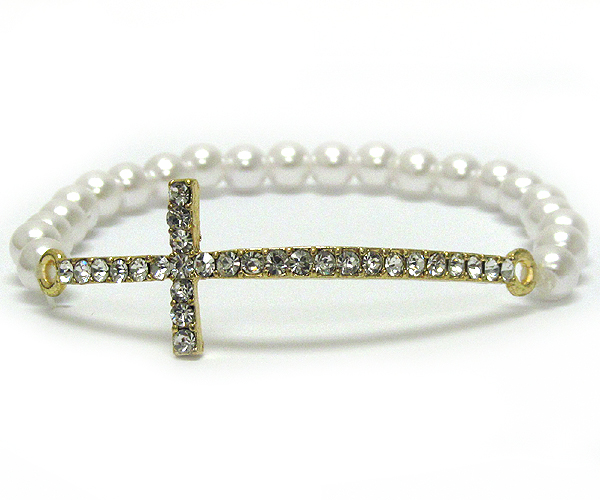 Crystal deco side cross and pearl band stretch bracelet