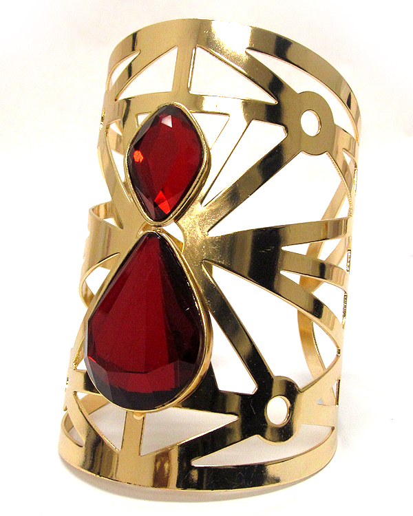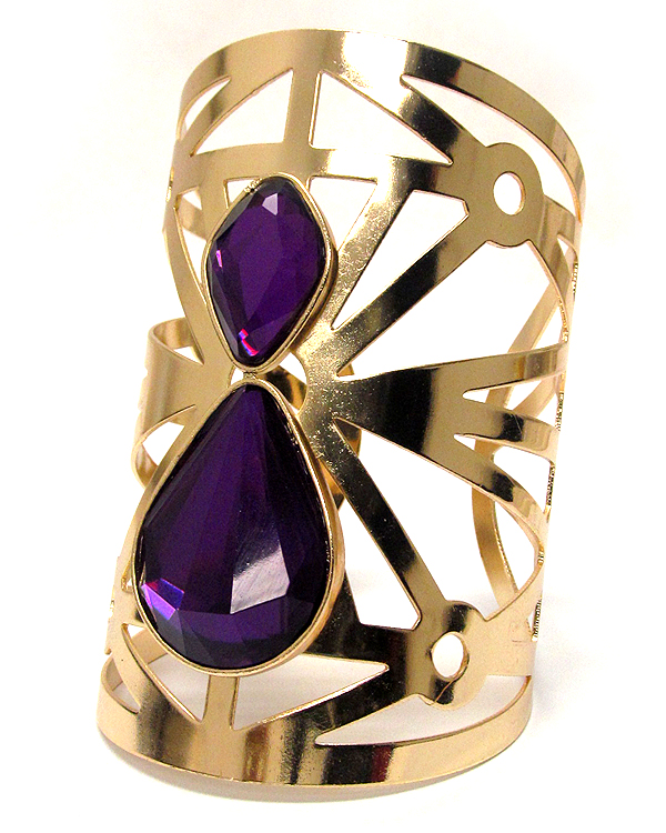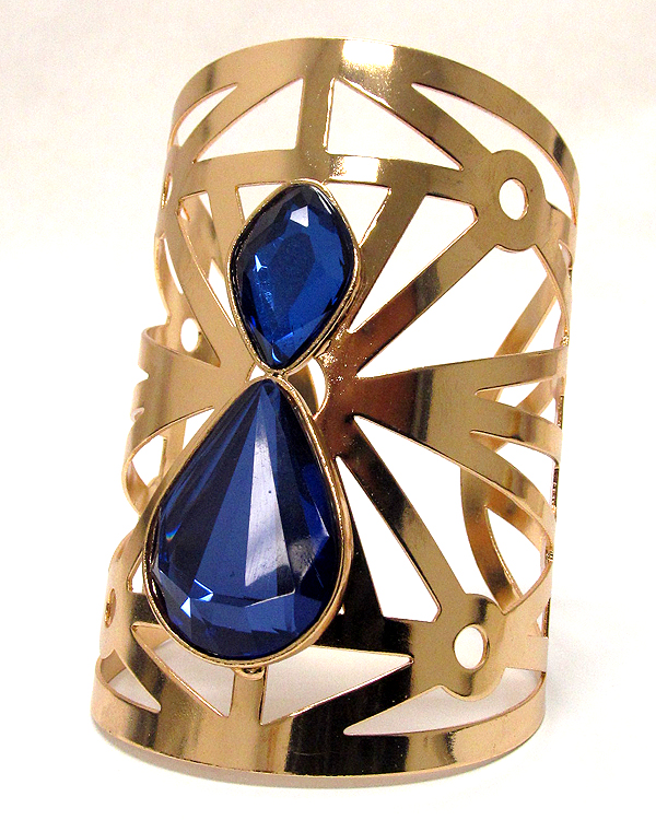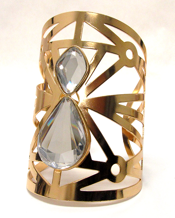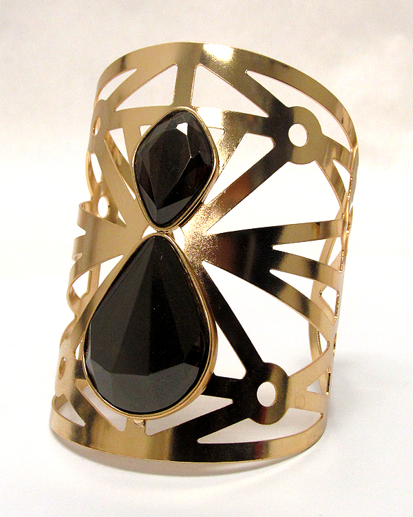 Two crystal glass with azteca cut out pattern theme metal cuff bangle -western