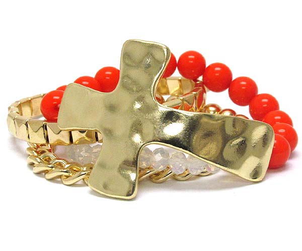 Hammered cross with acrylic ball and metal square spikes crystal glass chain stretch bracelet set of 4