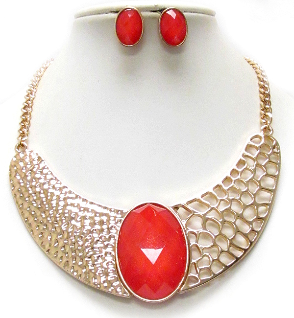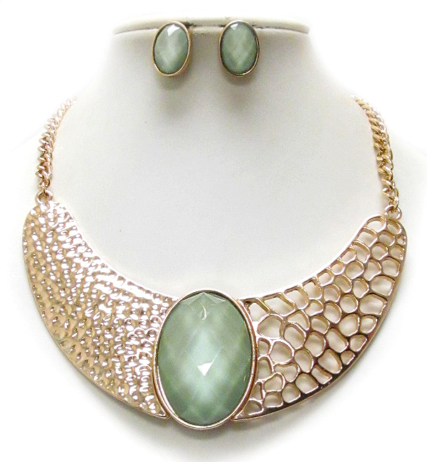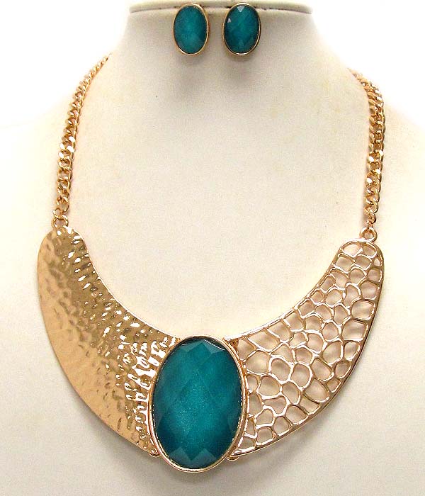 WHOLESALE HAMMERED AND CUT OUT METAL AND ON CENTER OVAL FACET CUT GLASS DROP CHAIN NECKLACE EARRING SET 388136