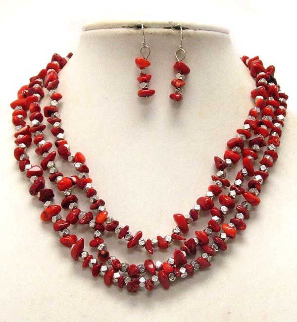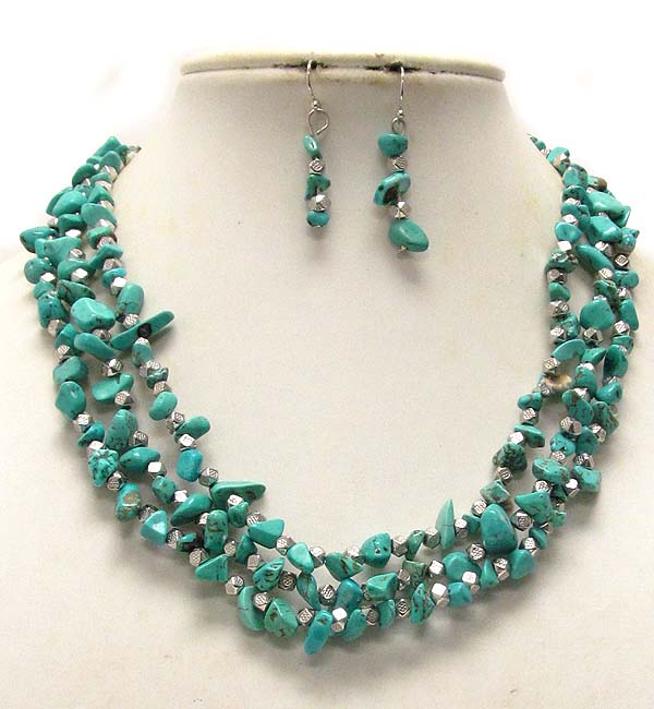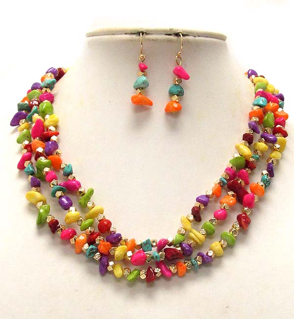 WHOLESALE MULTI NATURAL STONE AND METAL SEED BEAD TRIPLE CHAIN NECKLACE EARRING SET 388575