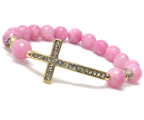 WHOLESALE CRYSTAL LEANED CROSS WITH MULTI ACRYL BALL AND CRYSTAL GLASS STRETCH BRACELET 388754