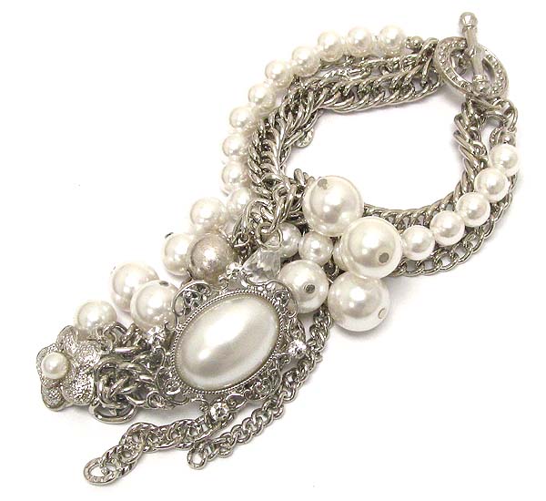 Crystal oval metal pearl and multi twist chain with multi pearl drop crystal metal flower charm dangle pearl toggle bracelet