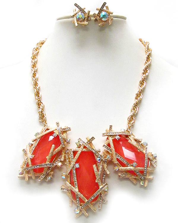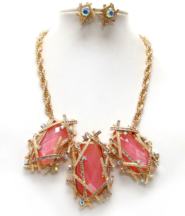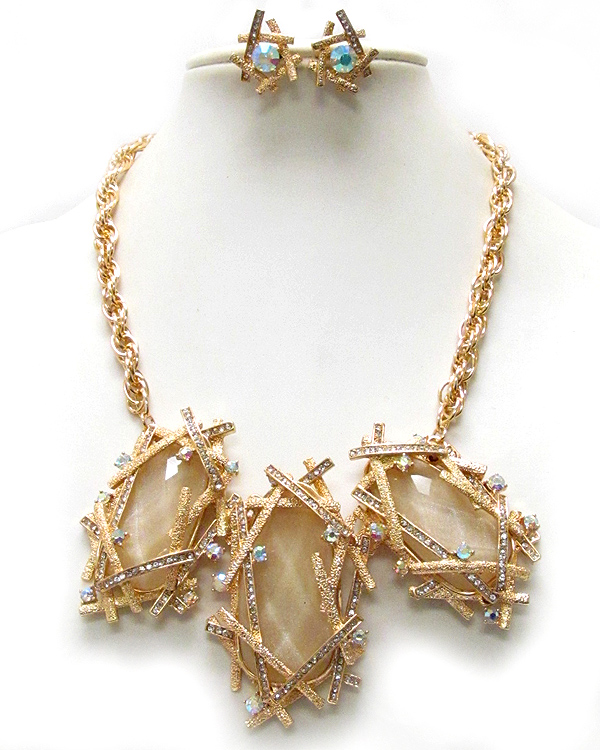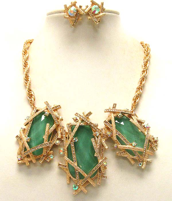 WHOLESALE ARCHITECTURAL STYLE TEXTERED METAL CONECTTED OVAL GLASS STONE DROP CHAIN NECKLACE EARRING SET 388860