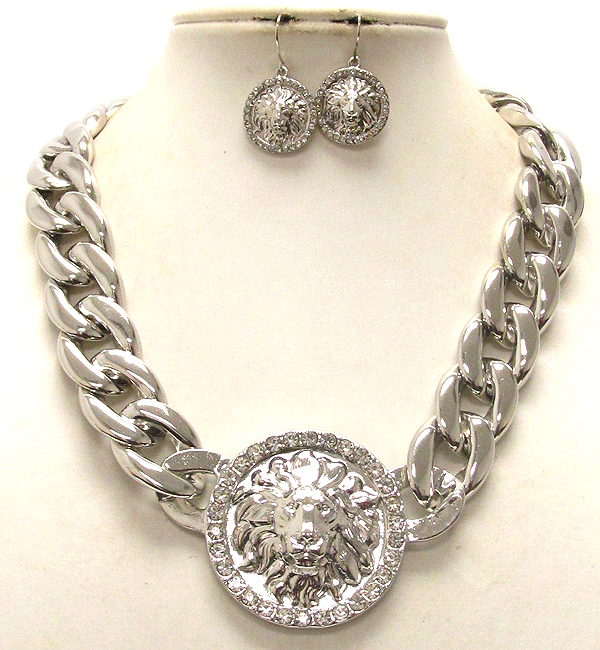 Crystal deco lion head and thick chain rhihana style necklace earring set