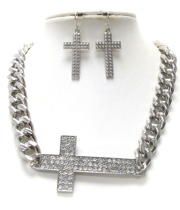 WHOLESALE CRYSTAL DECO SIDE CROSS AND THICK CHAIN NECKLACE EARRING SET 389862