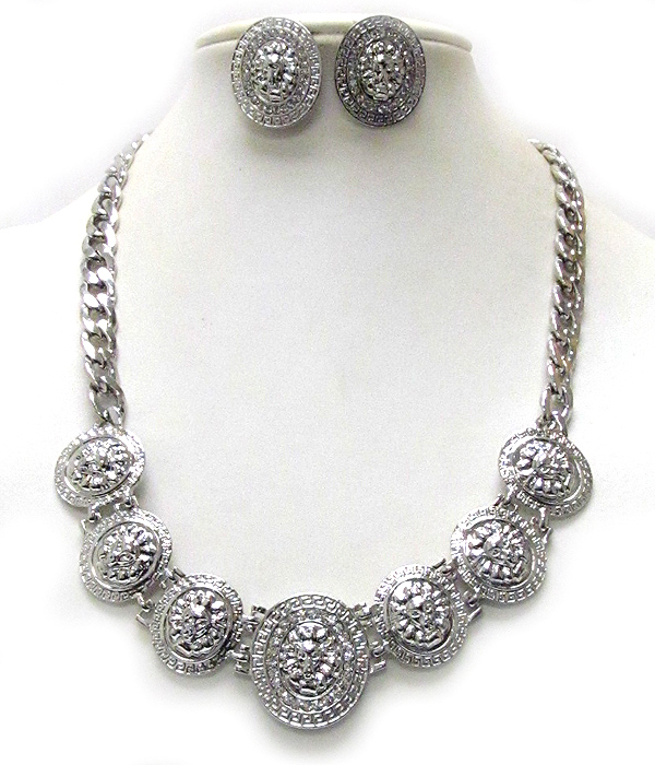 WHOLESALE MULTI METAL LION HEAD DISK LINK RIHANNA STYLE NECKLACE EARRING SET 390661