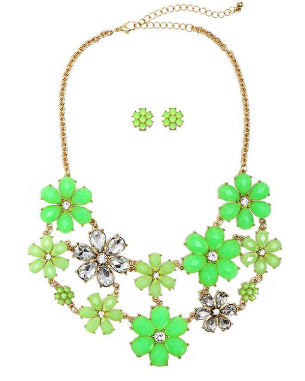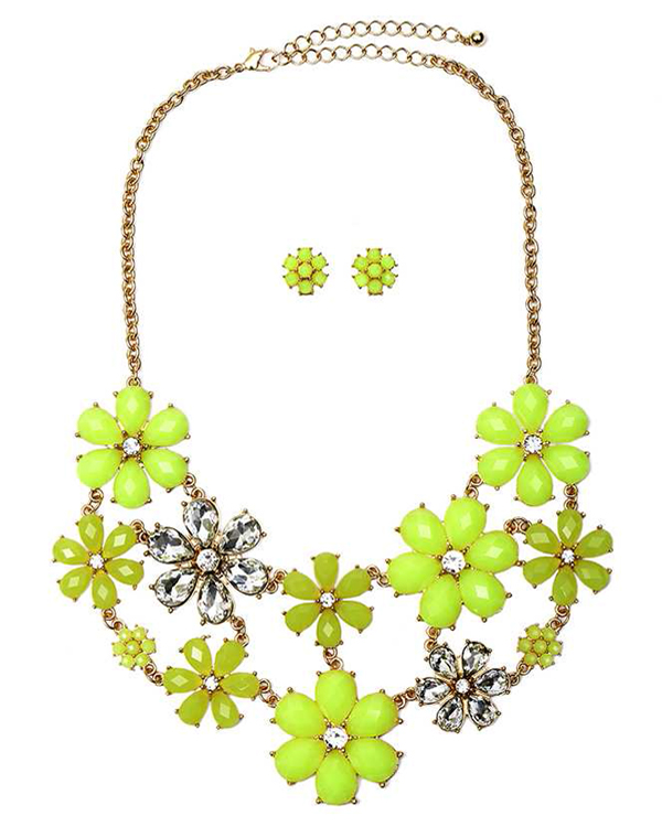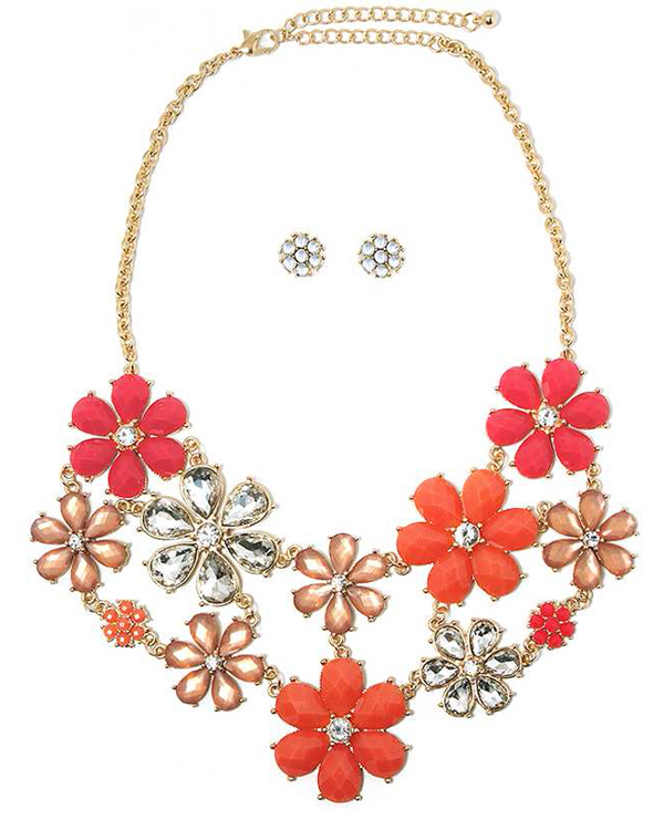 Multi crystal and facet acrylic stone flower link party bib necklace earring set