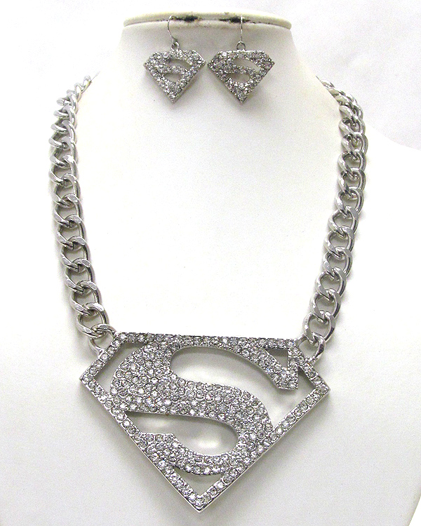 WHOLESALE CRYSTAL PAVED SUPERMAN SYMBOL PENDANT AND THICK CHAIN NECKLACE EARRING SET 391782