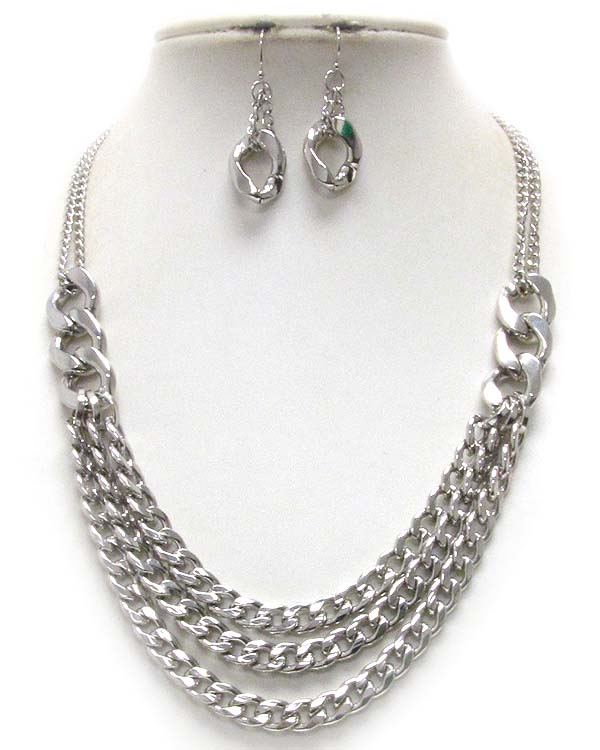 Three layered thck metal chain mix necklace earring set