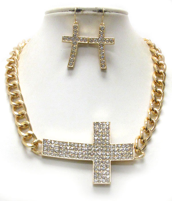 WHOLESALE CRYSTAL PAVE LARGE SIDE CROSS PENDANT AND THICK CHAIN NECKLACE EARRING SET 392121