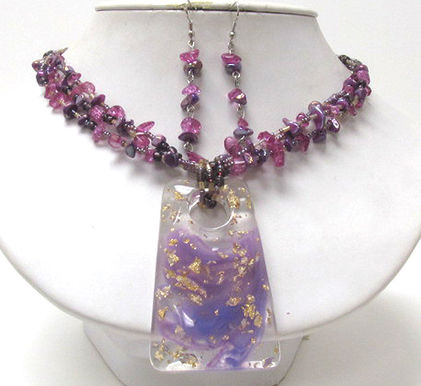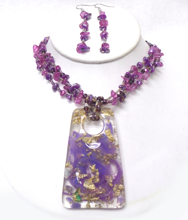 Decorate resin pendant and chip stone multi chain necklace earring set