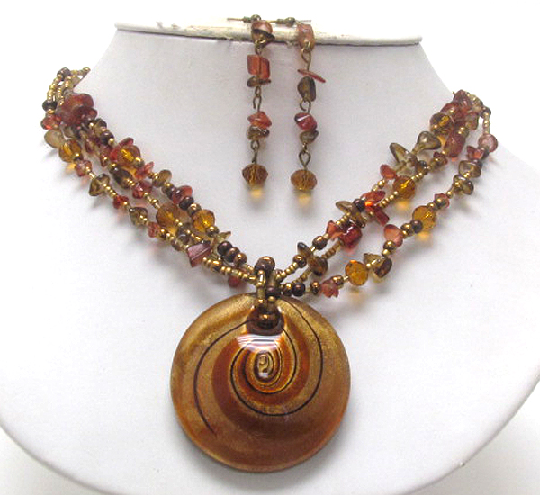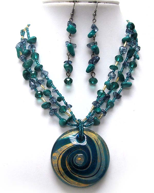 WHOLESALE MURANO GLASS DISK PENDANT AND CHIP STONE MULTI CHAIN NECKLACE EARRING SET 392572