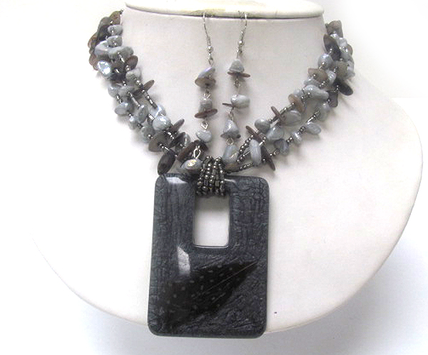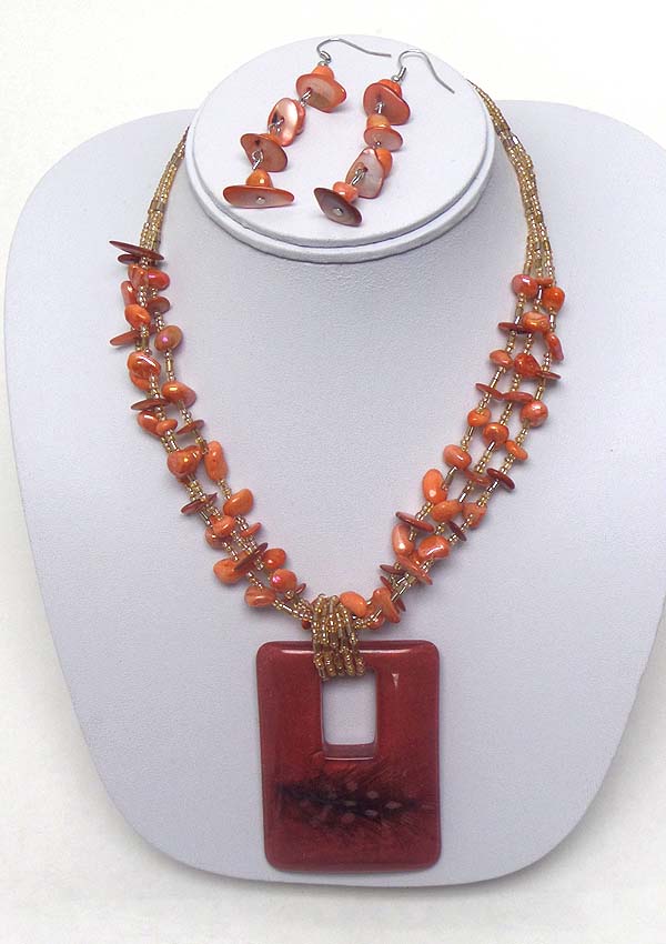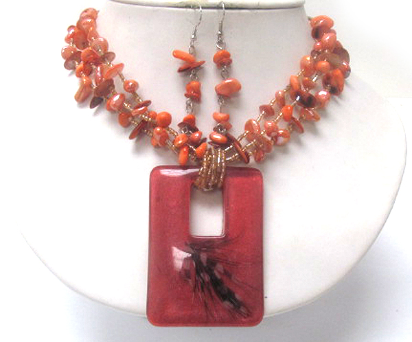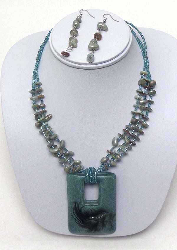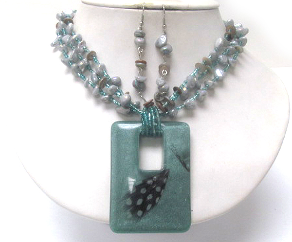 WHOLESALE FEATHER IN SQUARE PENDANT AND MULTI CHIP STONE CHAIN NECKLACE EARRING SET 392788