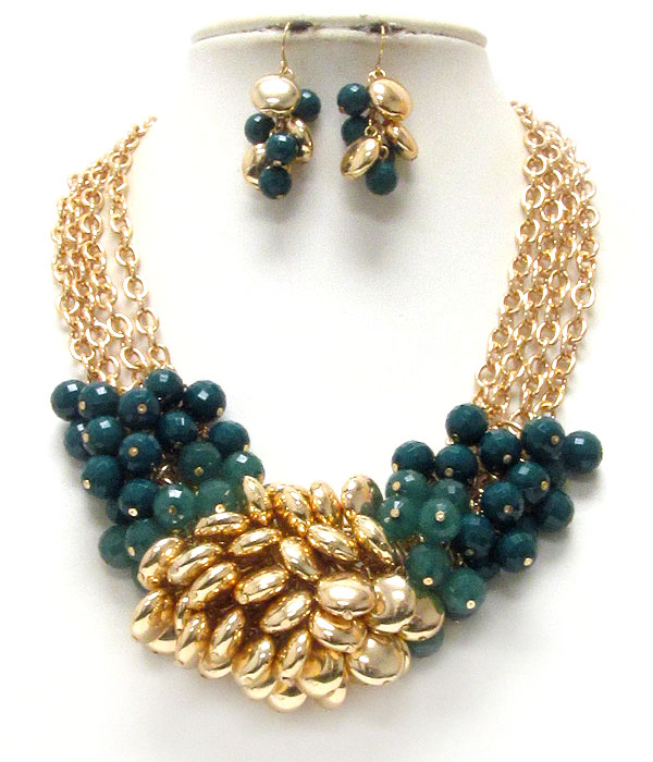 Chunky multi facet acrylic ball and metal chip deco and multi chain necklace earring set