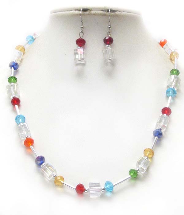 Facet glass ball and metal tube link necklace earring set