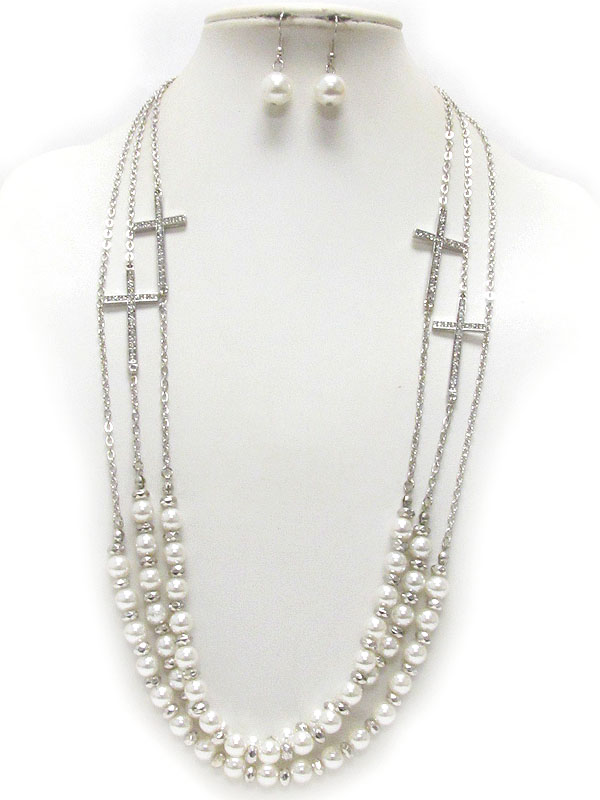 WHOLESALE CRYSTAL CROSS AND PEARL LINK THREE LAYER NECKLACE EARRING SET 394152