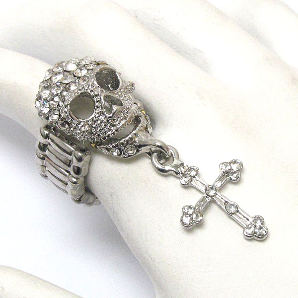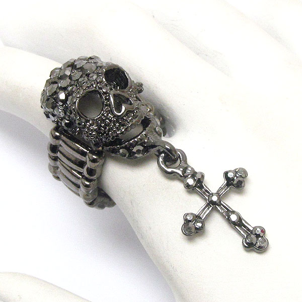 Crystal skull skeleton and cross drop stretch ring - halloween