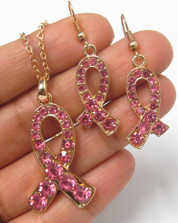 WHOLESALE CRYSTAL PINK RIBBON NECKLACE EARRING SET - BREAST CANCER AWARENESS 394870