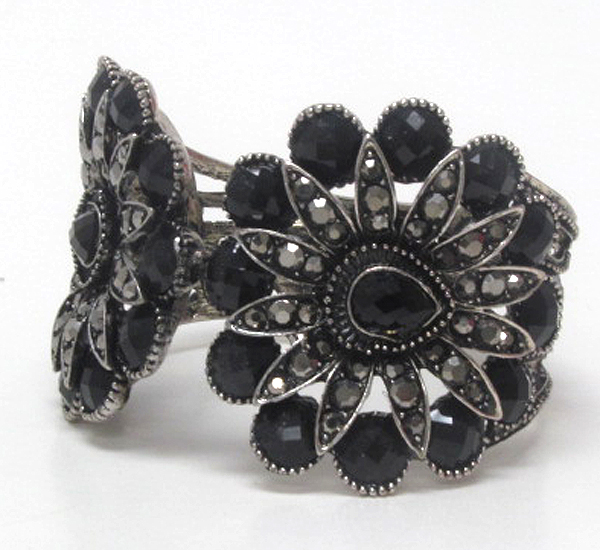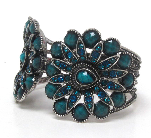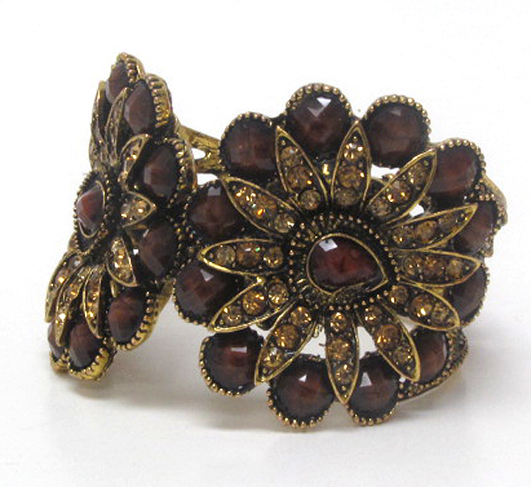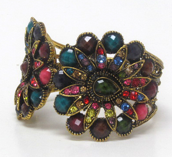 Multi crystal and resin double flower deco open bangle vintage bracelet