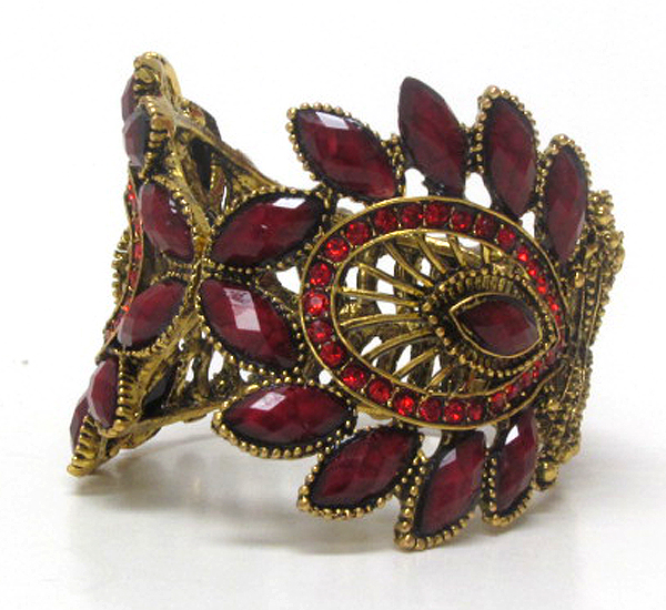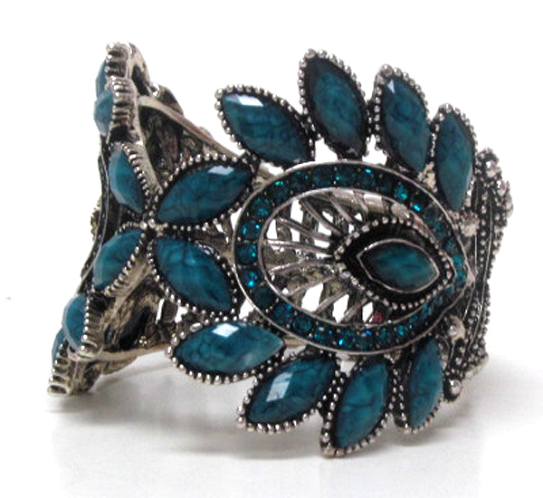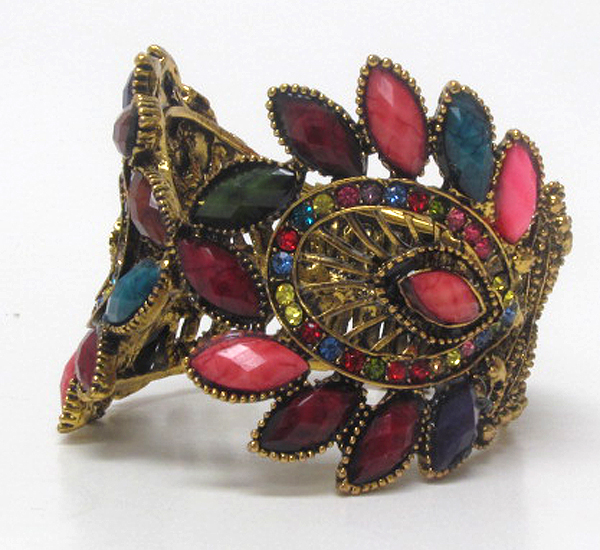 Multi crystal and resin double feather deco open bangle vintage bracelet