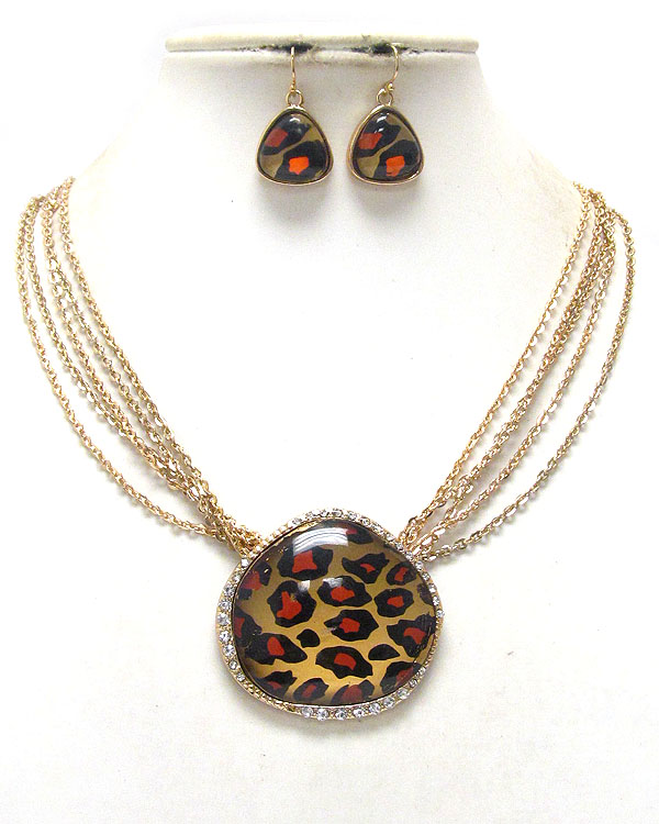 Animal print and crystal deco pendant and multu chain necklace earring set