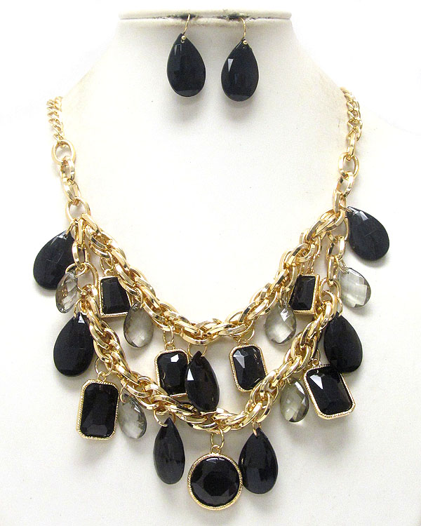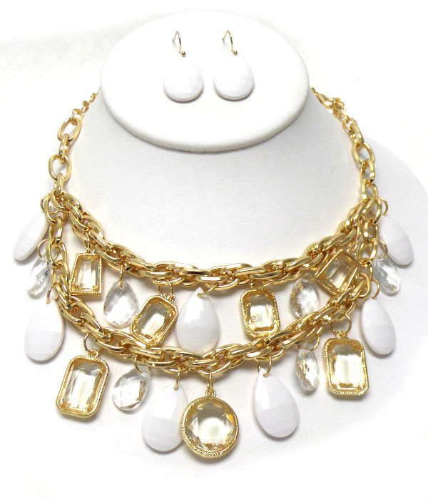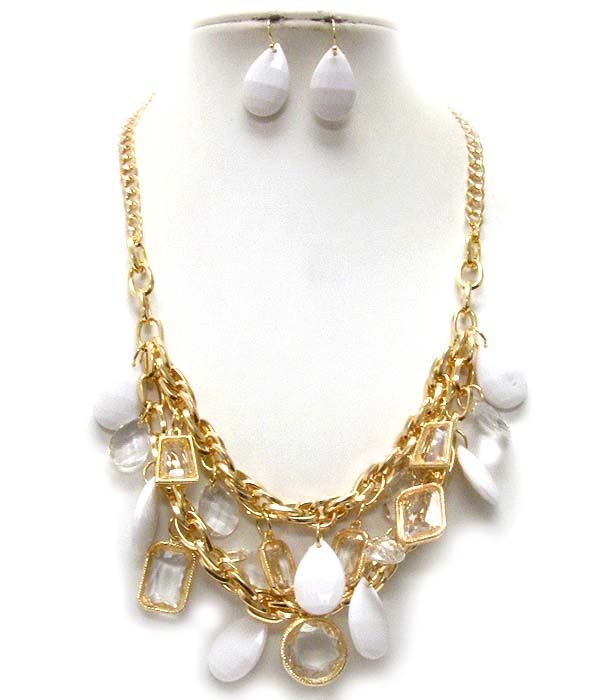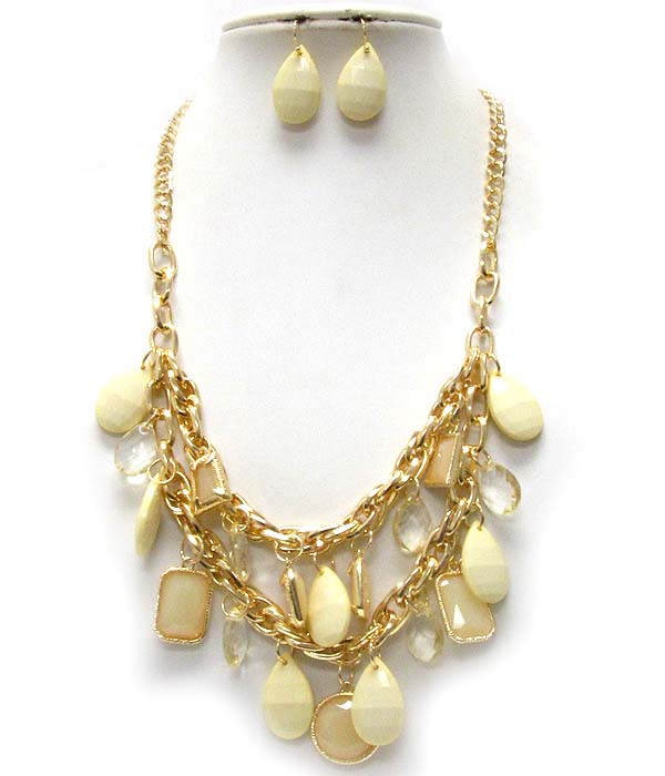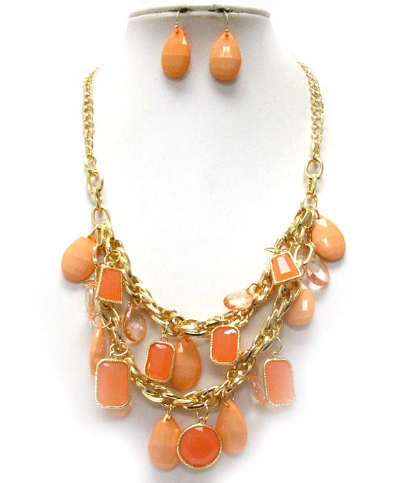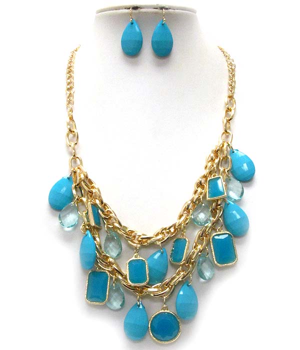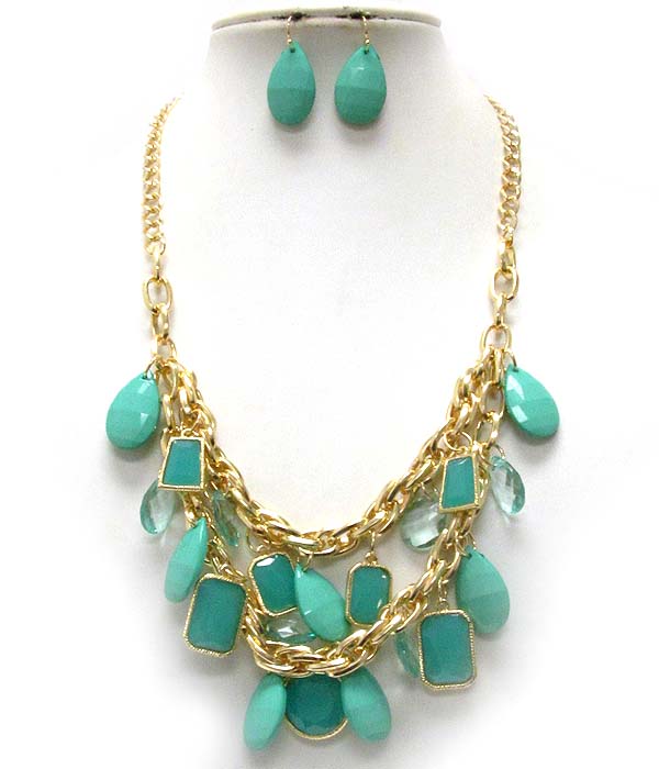 Multi teardrop and square acrylic stone drop double chain cocktail necklace earring set