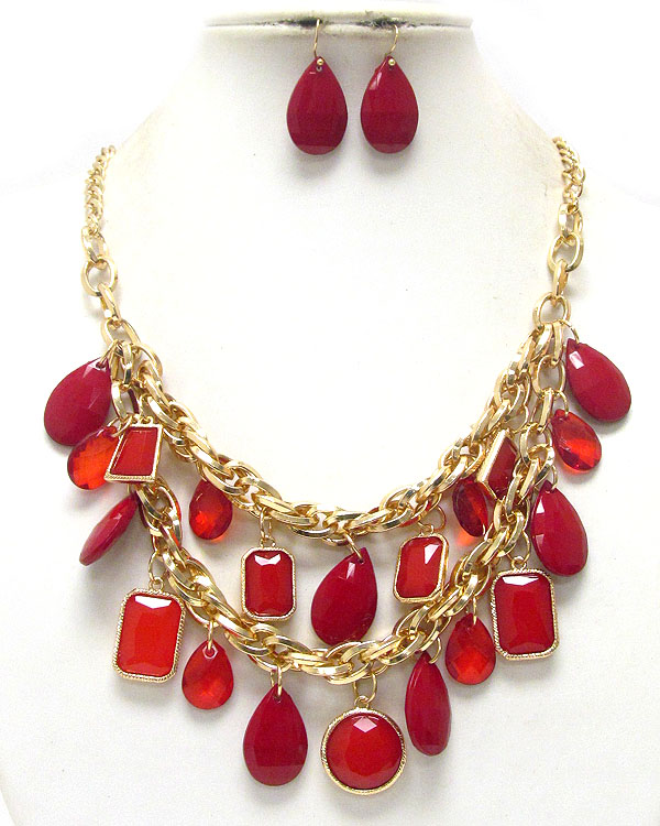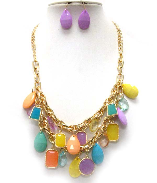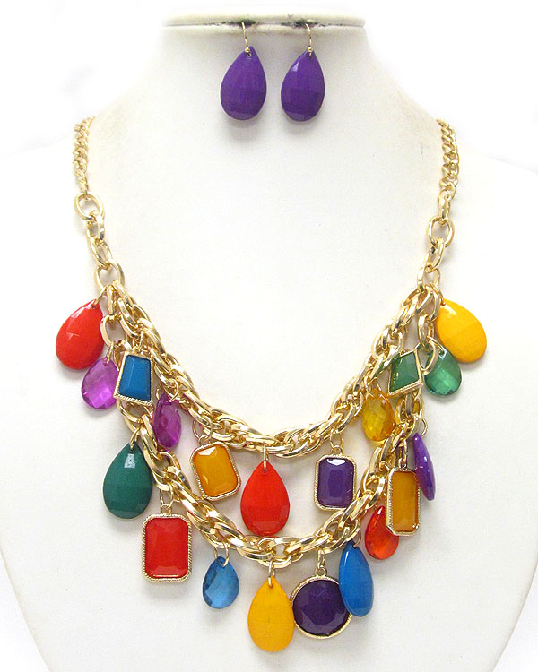 WHOLESALE MULTI TEARDROP AND SQUARE ACRYLIC STONE DROP DOUBLE CHAIN COCKTAIL NECKLACE EARRING SET 395383