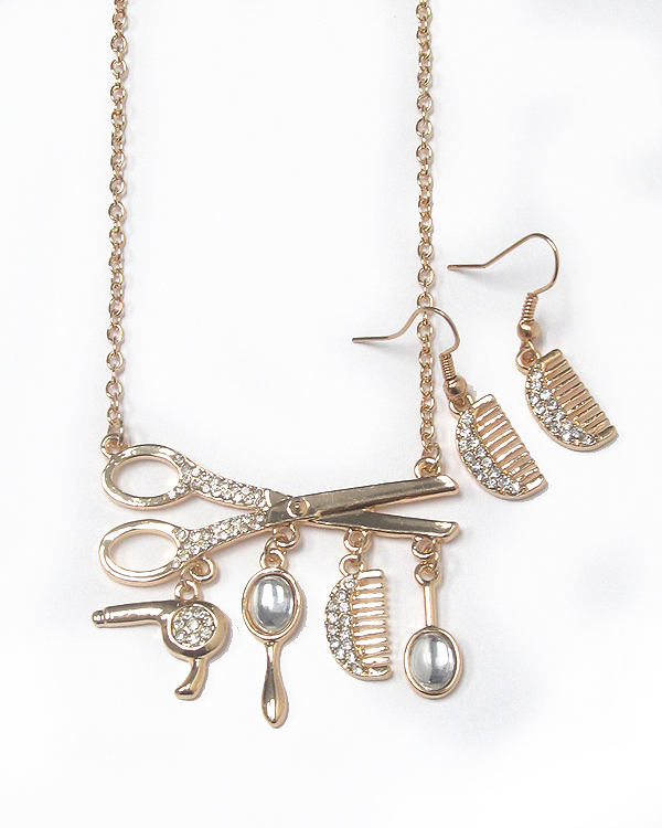 Crystal deco beauty shop theme scissor pendant necklace earring set