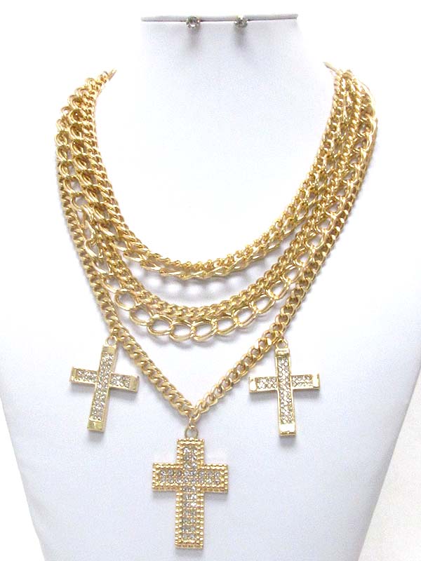 WHOLESALE TRIPLE CRYSTAL CROSS AND MULTI LAYERED CHAIN NECKLACE EARRING SET 396328