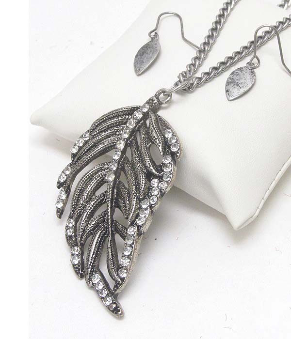 Crystal deco vintage leaf pendant long necklace earring set