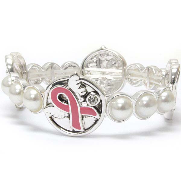 Crystal and pearl deco pinkribbon bow and angel wing stretch bracelet