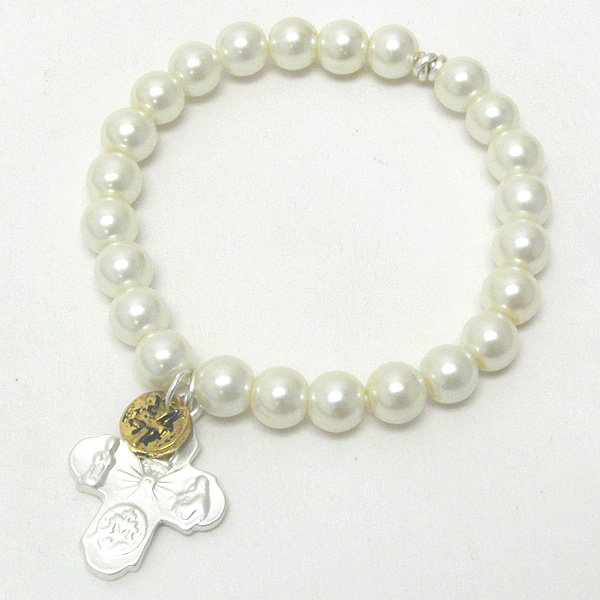 WHOLESALE METAL CROSS CHARM AND PEARL STRETCH BRACELET 398270