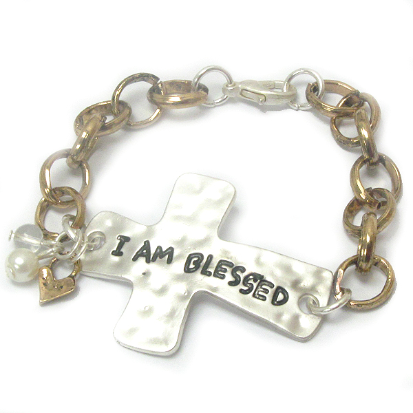 WHOLESALE RELIGIOUS INSPIRATION HAMMERED CROSS BRACELET - I AM BLESSED 399040