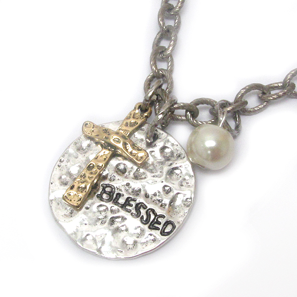 WHOLESALE VINTAGE METAL AND RELIGIOUS INSPIRATION CROSS AND DISK NECKLACE - BLESSED 399050