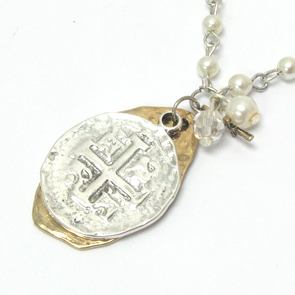WHOLESALE VINTAGE METAL CROSS ON DISK AND PEARL CHAIN NECKLACE 399063