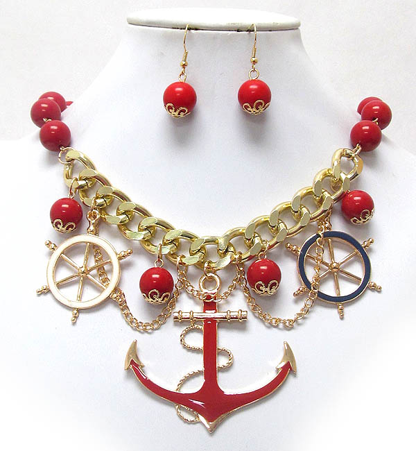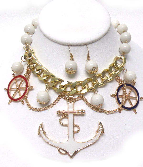 WHOLESALE EPOXY ANCHOR AND WHEEL DANGLE ON METAL CHAIN NECKLACE EARRING SET 399147