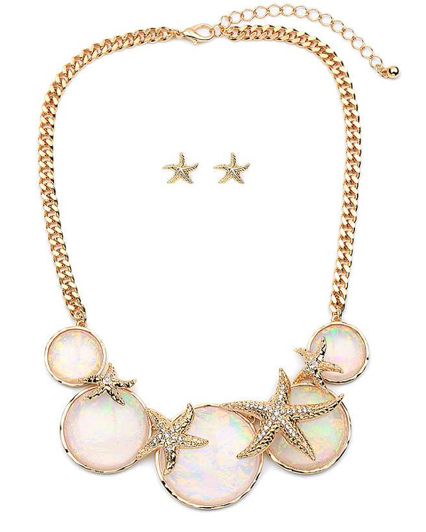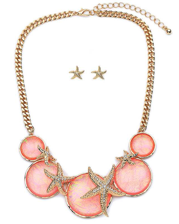 WHOLESALE CRYSTAL STARFISH AND MULTI ABALONE FINISH PUFFY STONE LINK NECKLACE EARRING SET 400542