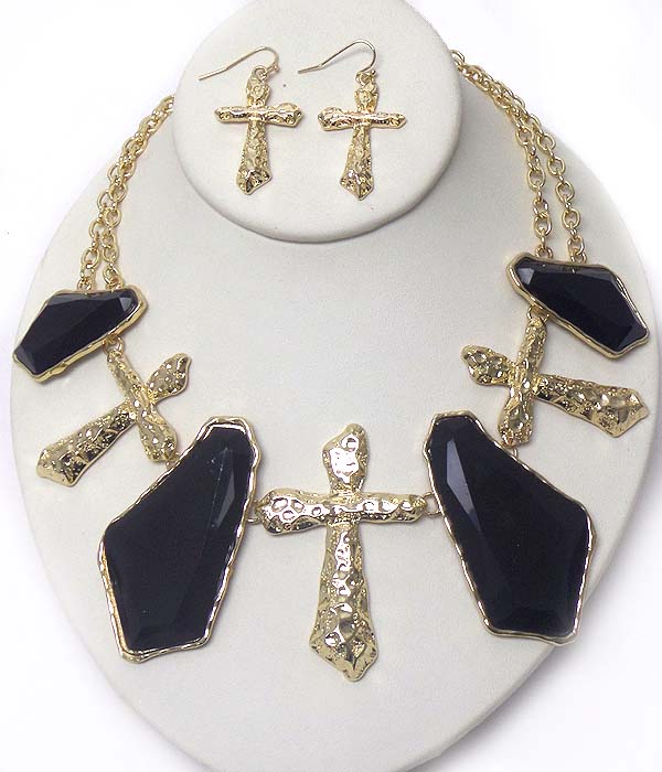 WHOLESALE HAMMERED CROSS AND FACET STONE LINK NECKLACE EARRING SET 400801